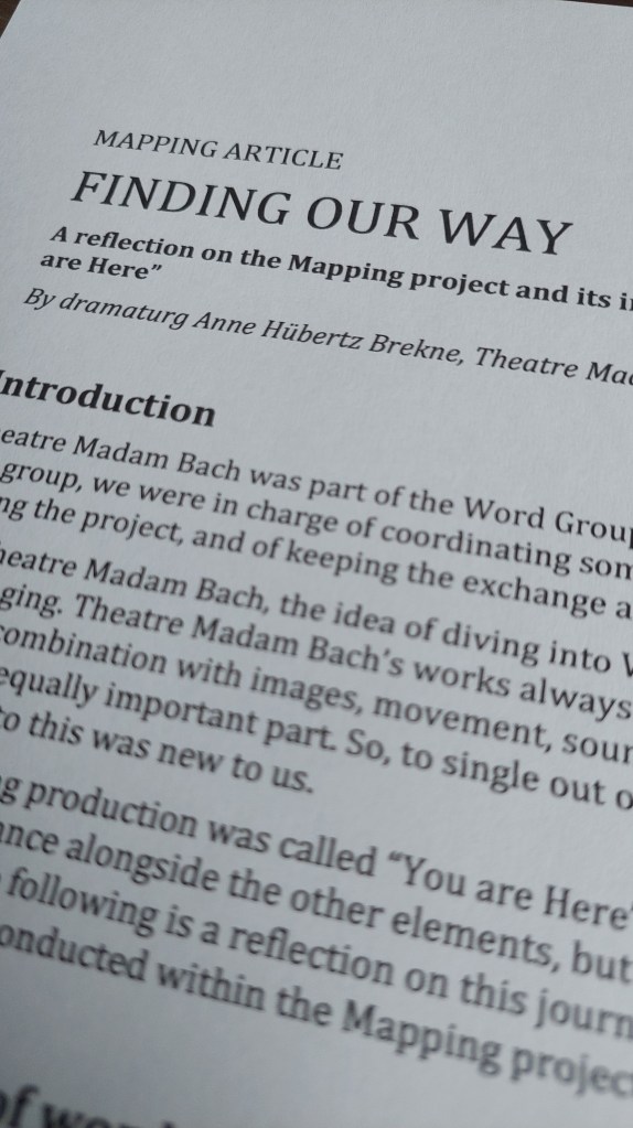 Jeg er for tiden i gang med at skrive en artikel om den kunstneriske proces og de dramaturgiske valg bag forestillingen “Du er Her” af Teaterværkstedet Madam Bach. Artiklen bliver del af en større publikation i regi af det fire-årige EU-projekt Mapping – a Map on the Aesthetics of Performing Arts for Early Years, som afsluttes i år. Projektet er et internationalt udvekslings- og udviklingsprojekt, som kortlægger mulige retninger og strategier for scenekunst for de yngste. Jeg har fulgt projektet hele vejen som dramaturg for Teaterværkstedet Madam Bach og glæder mig helt vildt til at se resultaterne af alt det gode kunstneriske forskningsarbejde, som er pågået på tværs af landegrænserne gennem de seneste 4 år.